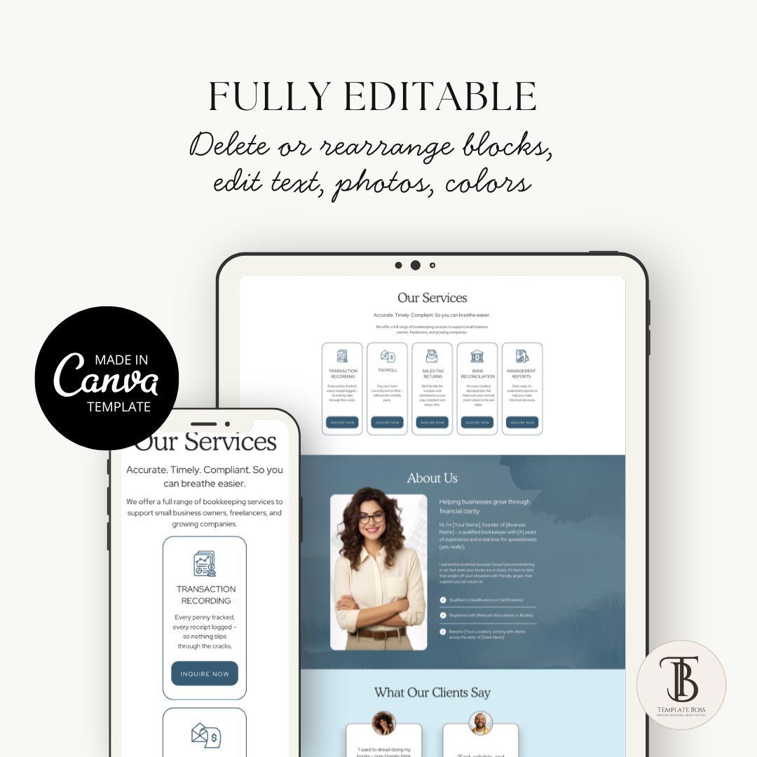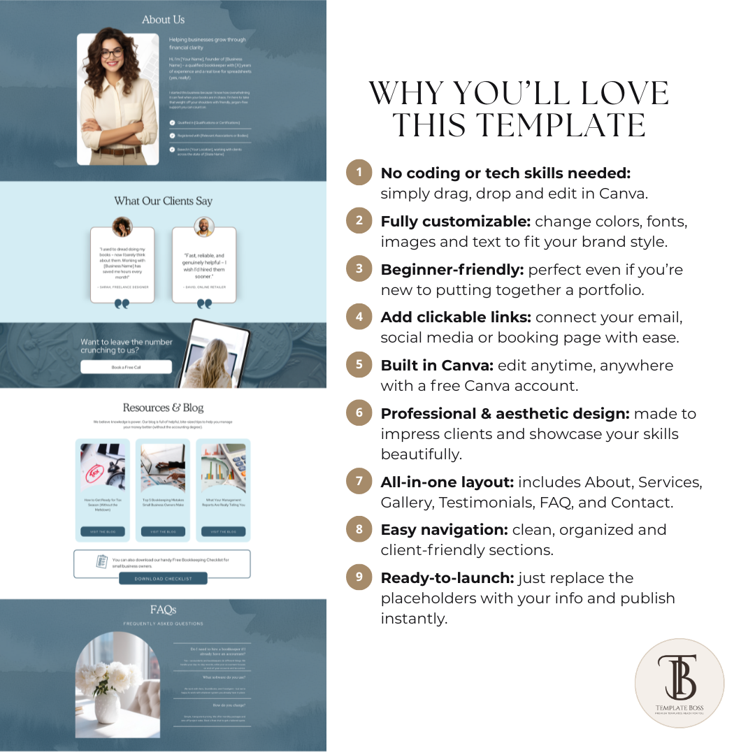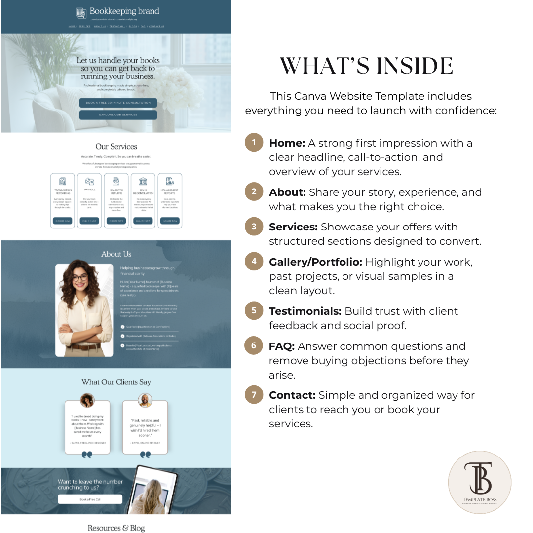 This Canva website template is built for bookkeepers, accountants, tax pros, and financial service providers who want a clean, credible online presence without hiring a designer.