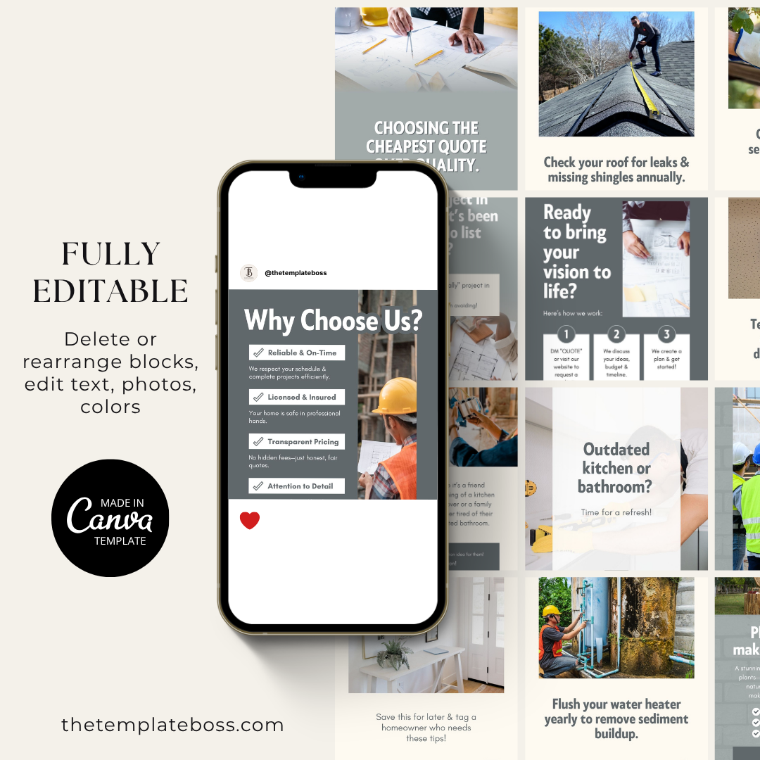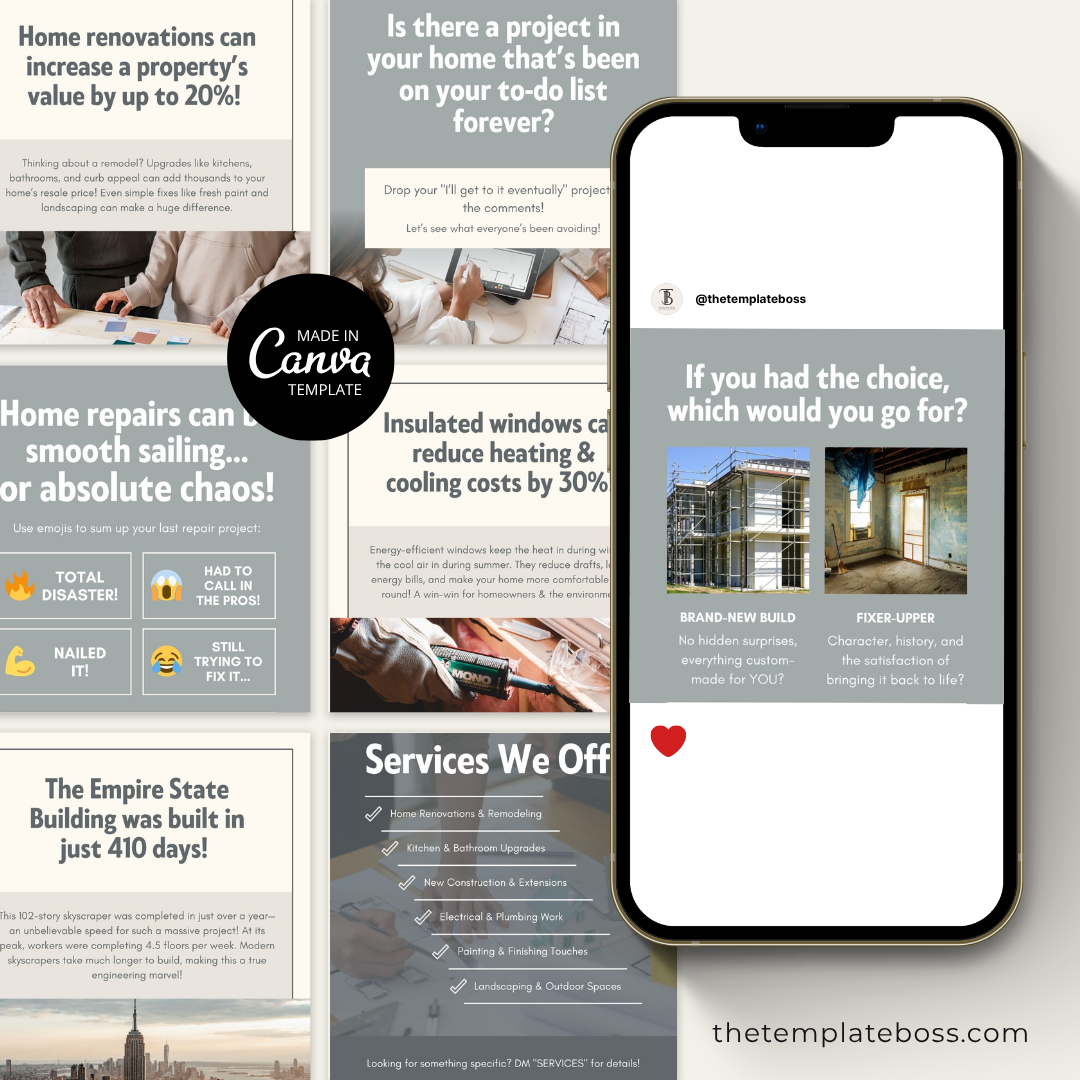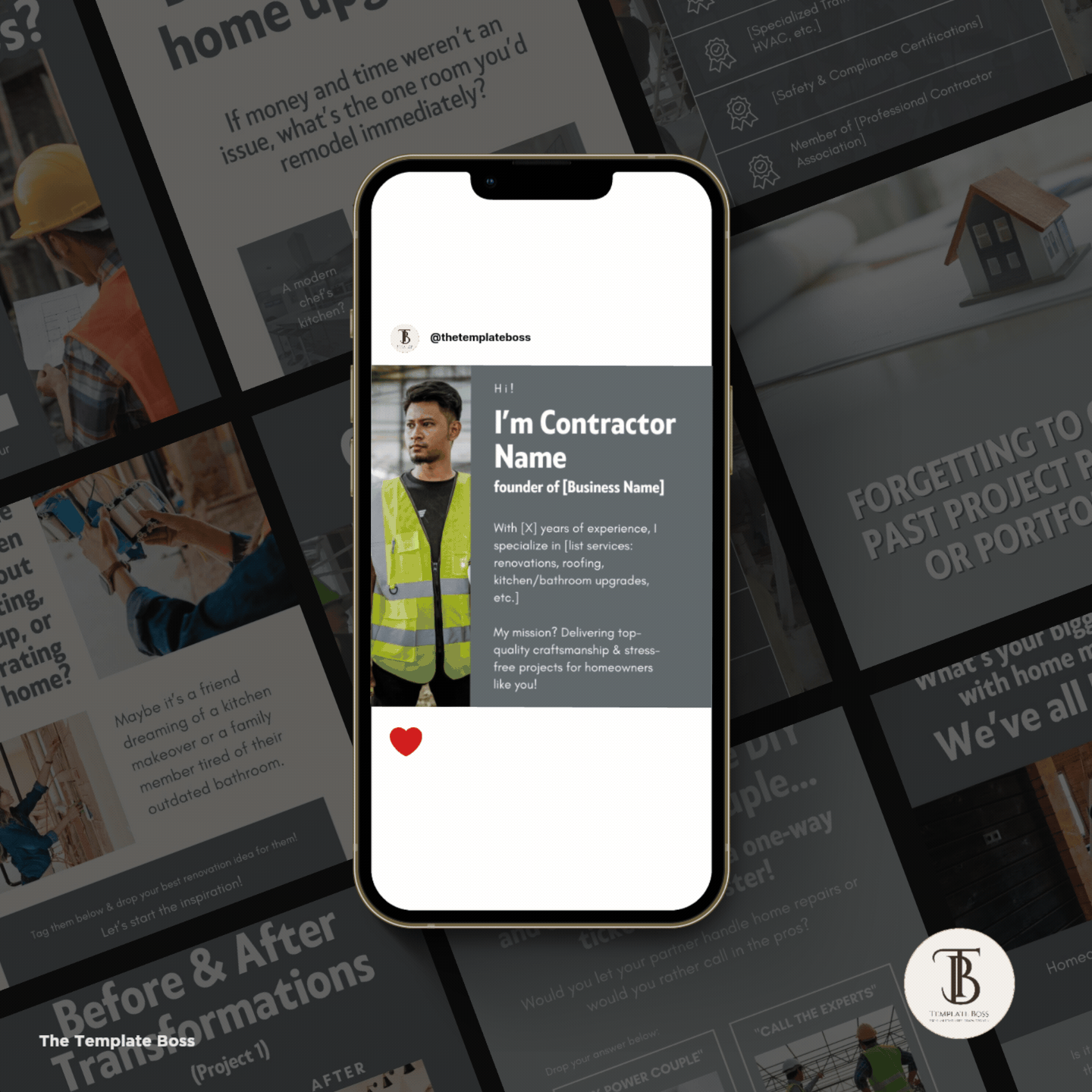 This pack gives you 94 ready-to-use social media templates to help you show your work, build trust, and get booked. Perfect for for Builders, Remodelers & Home Service Businesses.